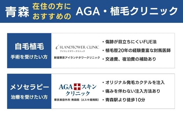 青森県内では植毛手術を実施しているクリニックが存在しないので、東京新宿にある「新宿東京アイランドタワークリニック」がオススメします。植毛手術は外科手術となり、自然な仕上がりにするには技術が必要となります。FUE法が1株990円~、植毛歴20年と経験豊富な封馬医師と開院20年以上の植毛手術専門スタッフがいる新宿東京アイランドタワークリニックがおすすめです。無料カウンセリング、手術日当日の青森から東京までの交通費や東京での宿泊費のサポート制度もあるので安心です!