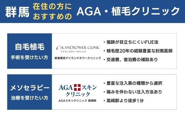 代表的な治療法として「メソセラピー」や「HARG療法」などが存在し、服薬での治療で発毛効果が不十分であったり実感できなかった方が、より大きな発毛効果を獲得するためのサポート治療として確立しています。群馬では前橋駅、高崎駅、新伊勢崎駅周辺で注入療法でのAGA治療を提供しているクリニックがあります。自分に合ったAGA治療を提供しているクリニックを探してみましょう。